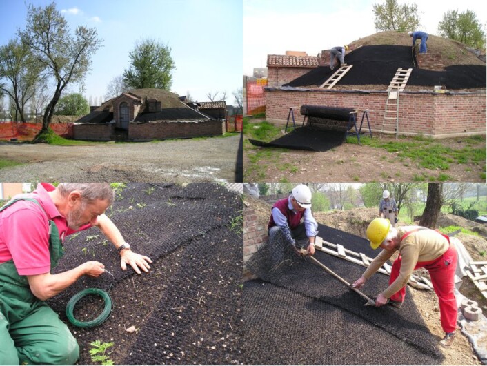 Per facilitare la semina ed evitare il dilavamento meteorico durate l'attacchimento la superficia della cupola è stata protetta da una geostuoia fornita dalla Italdreni. Il Sig. Ingegnoli di persona durante il sopralluogo sul cantiere ha consigliato di seminare la festuca rubra una essenza stolonifera che avrebbe creato un tessuto vegetale compatto.