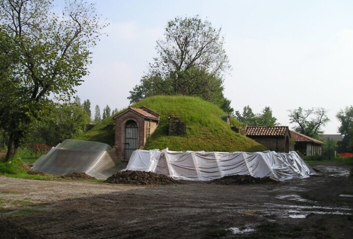 Posa della guaina bugnata Delta a ridosso della parete laterale della ghiacciaia. Sulla cupola verrà posata una guaina drenante (Dorken Delta-NP-Drain) accoppiata con tessuto non tessuto.