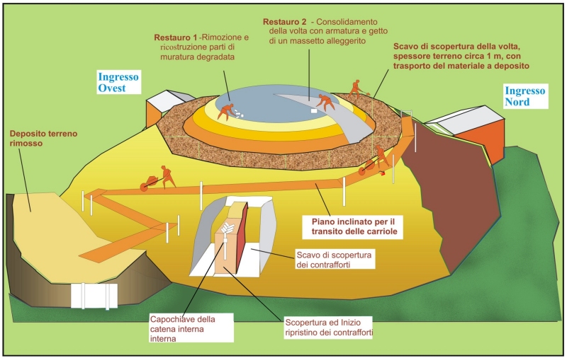 Un primo ingresso fu identificato e liberato dai rovi sul lato nord così da permettere, con una torcia elettrica, una prima ispezione. Ai volontari che per la prima volta si affacciarono al cunicolo che permetteva di accedere all’interno, si presentò illuminata dalla poca luce della lampada, una grande volta in mattoni che copriva un notevole spazio circolare; il cunicolo non arrivava al piano del pavimento e sotto si intravedevano materiali di vario genere accumulatisi nel tempo. Sul lato destro filtrava una fioca luce da un’apertura che interessava la parete verticale e parte della volta: era quello che avremmo in seguito scoperto, l’ingresso Ovest.
